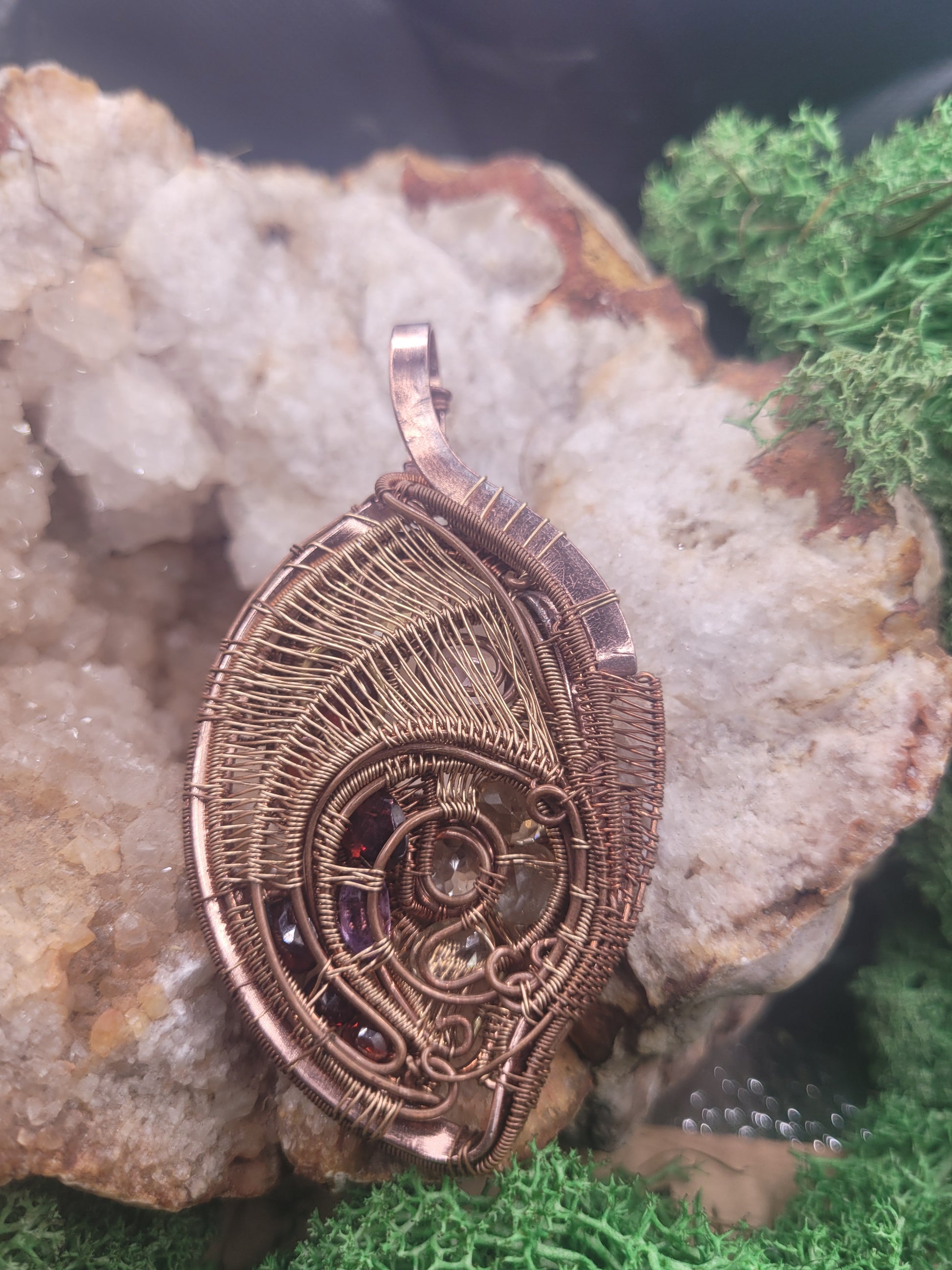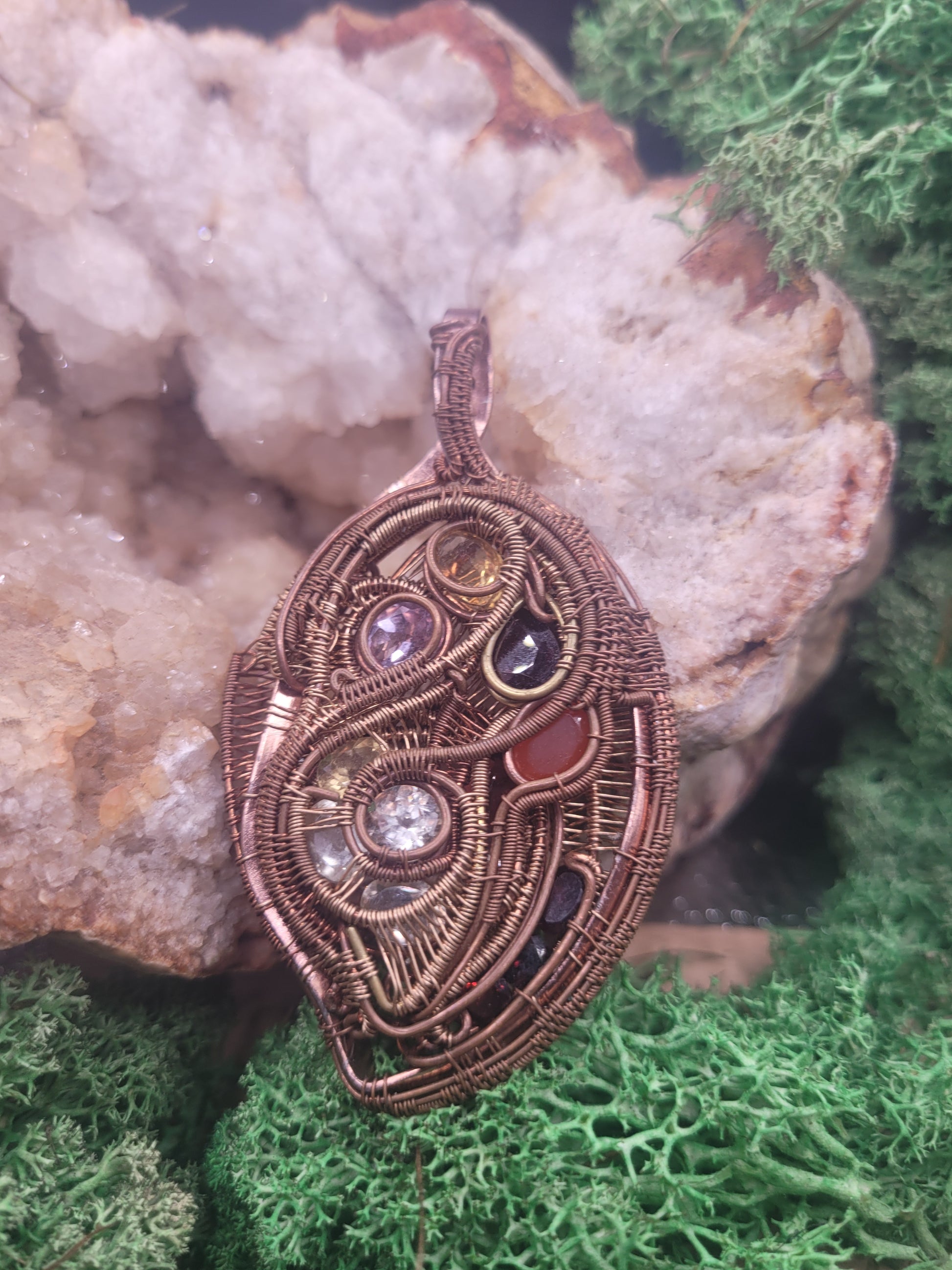 Forged in copper and brass, this enchanted talisman hums with elemental fire and light. Five Citrines radiate vitality, while Carnelian stirs courage and creativity. Garnets ignite passion and grounding, and twin Amethysts weave calm and clarity. A relic of alchemy—crafted to awaken the inner mage and channel radiant energy.
