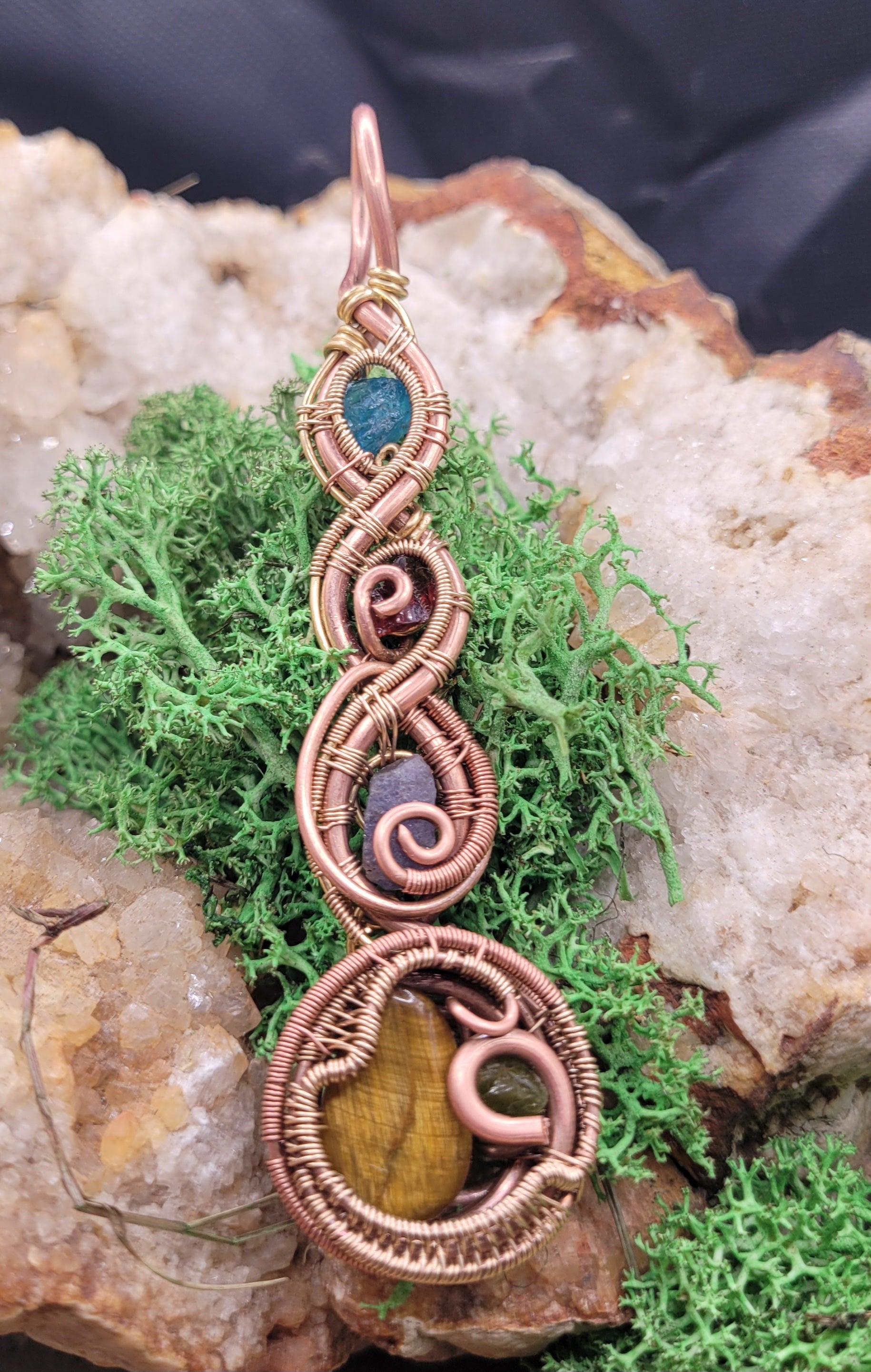 “World Helix” is a mesmerizing wire-wrapped pendant crafted from brass and copper, spiraling upward in a double helix form that mirrors life’s infinite dance. Blue apatite awakens vision, garnet fuels passion, tanzanite bridges realms, golden tiger’s eye grounds energy, and green peridot renews the heart—together forming a powerful harmony of balance and transformation.